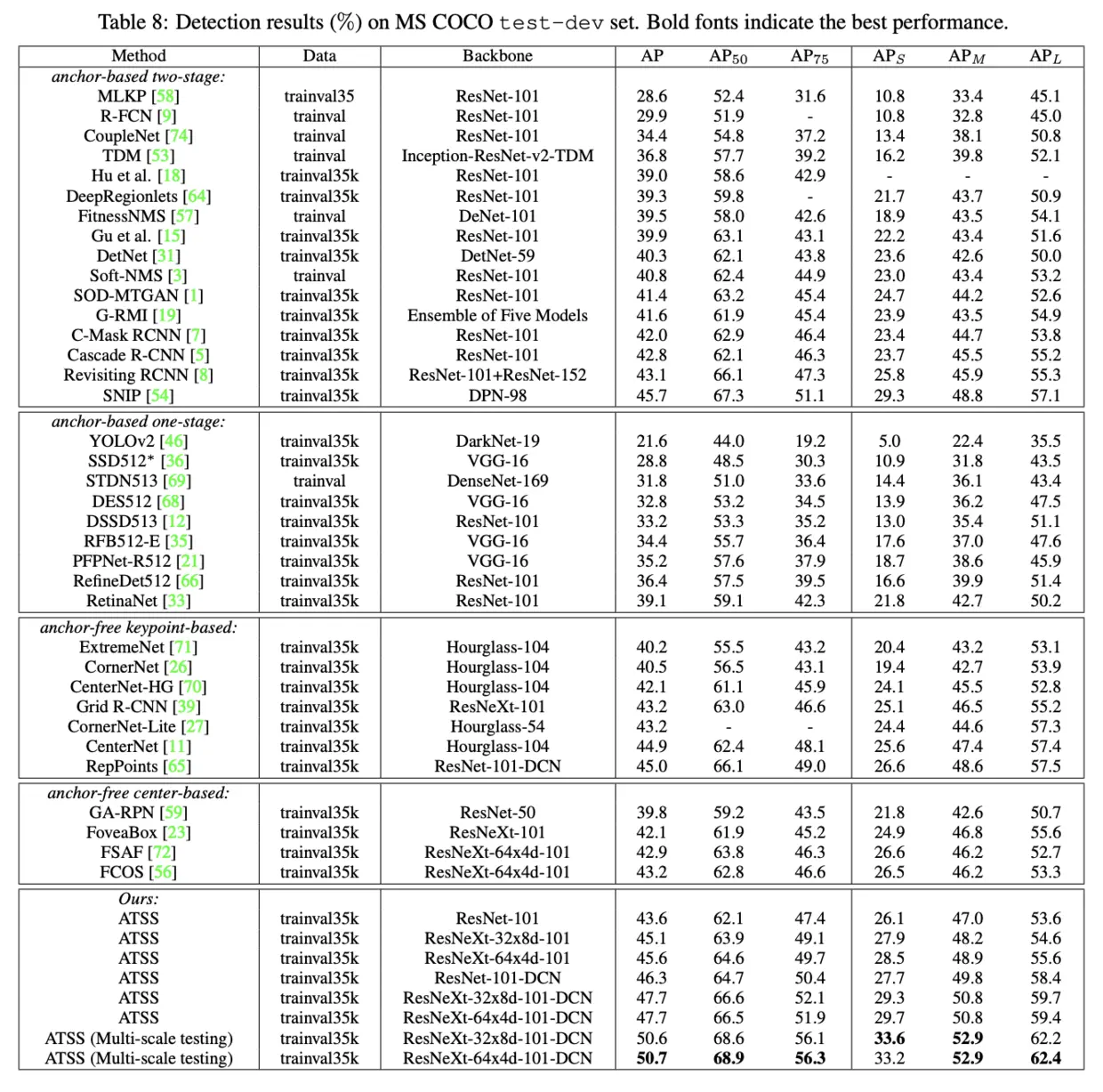 论文指出one-stage anchor-based和center-based anchor-free检测算法间的差异主要来自于正负样本的选择,基于此提出ATSS(Adaptive Training Sample Selection)方法,该方法能够自动根据GT的相关统计特征选择合适的anchor box作为正样本,在不带来额外计算量和参数的情况下,能够大幅提升模型的性能,十分有用