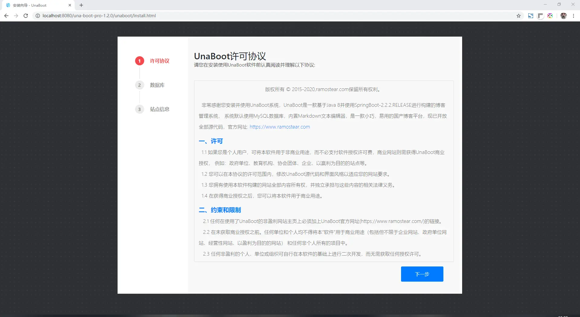 以我在本地演示为例,浏览器中输入http://localhost:8080/una-boot-pro-1.2.0/unaboot/install.html ,访问成功后,你将看到入下的安装向导界面: