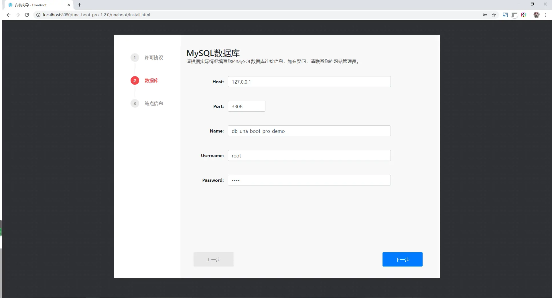 阅读完许可协议并同意后,你可进入数据库配置界面。在此界面中,你需要提供MySQL数据的主机地址(例如localhost或127.0.0.1),数据库的端口号(默认端口号为3306),存储尤娜博客数据的数据库名称(例如在上一步中创建的db_una_boot_pro_demo数据库),数据库的访问账号以及访问密码。