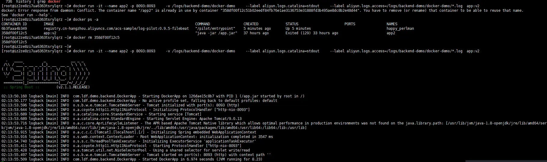 docker run -it --name app2 -p 8093:8093 -v /logs/backend-demo/docker-demo --label aliyun.logs.catalina=stdout --label aliyun.logs.access=/logs/backend-demo/docker-demo/*.log app:v2