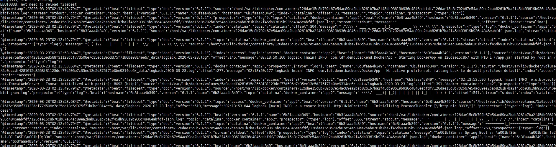 ps: /logs/backend-demo/docker-demo为app得日志输出目录 -v 挂在该目录使得log-pilot容器可以访问到app镜像得日志文件, --label aliyun.logs.access=告诉log-pilot要采集得app日志文件