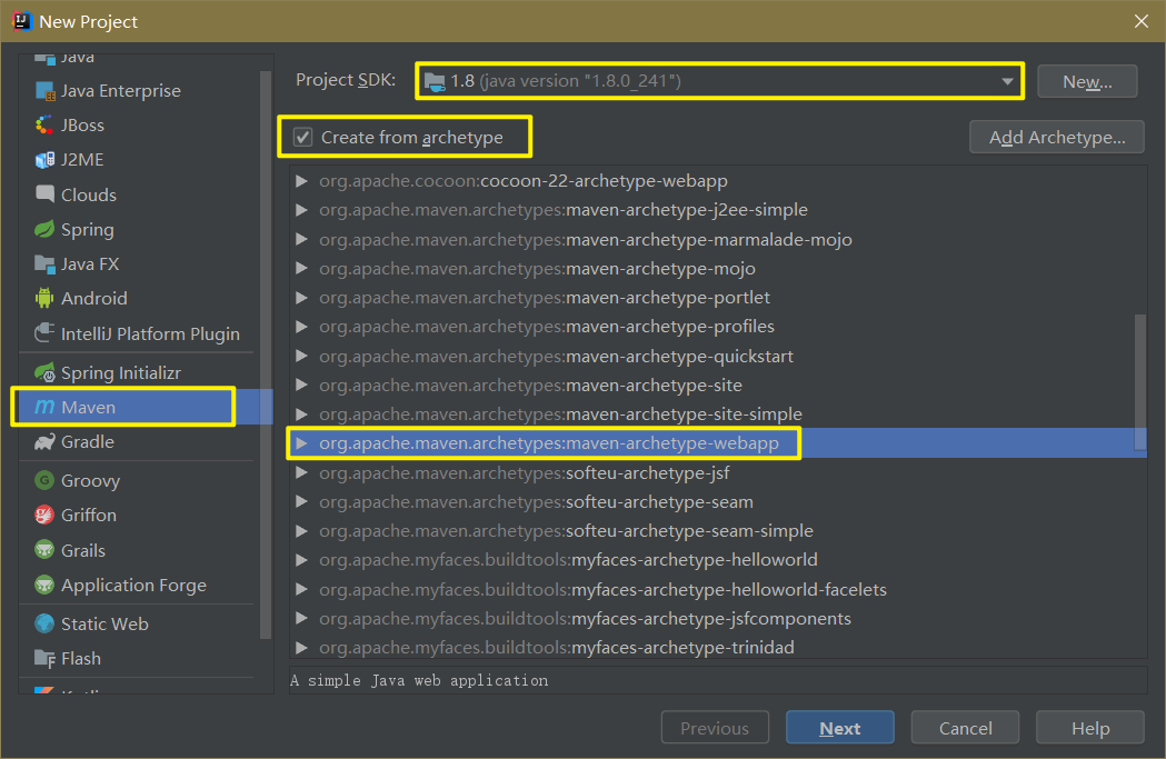 ① 创建Maven项目 --> ② 选择JDK版本 --> ③ 勾选 create from archetype 即使用骨架创建项目 --> ④ 选择 maven-archetype-webapp 创建出一个web项目