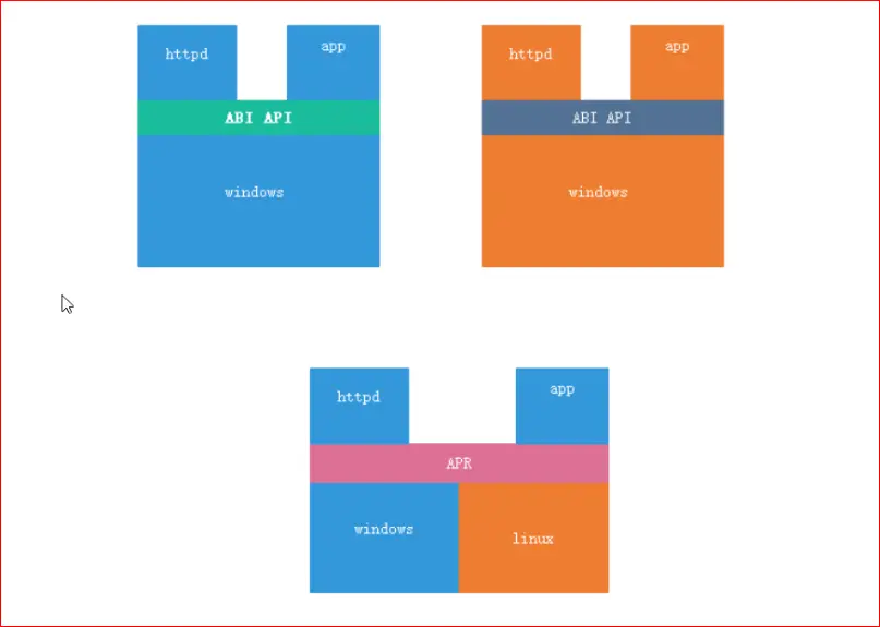 apache名下上百个项目,window和linux以及macos三个团队,一共就300个团队,解决,将window和linux的ABI和API接口抽象出来做成APR接口间接的访问windows和linux,以后Apache的软件只要满足这个APR接口就可以了,这时候100个项目只需要100个团队了,当然还有两个windows和Linux团队,加起来也就102个团队,原本要200个团队,就大大减轻了开发成本,类似加了一个虚拟层,来屏蔽底层的不同