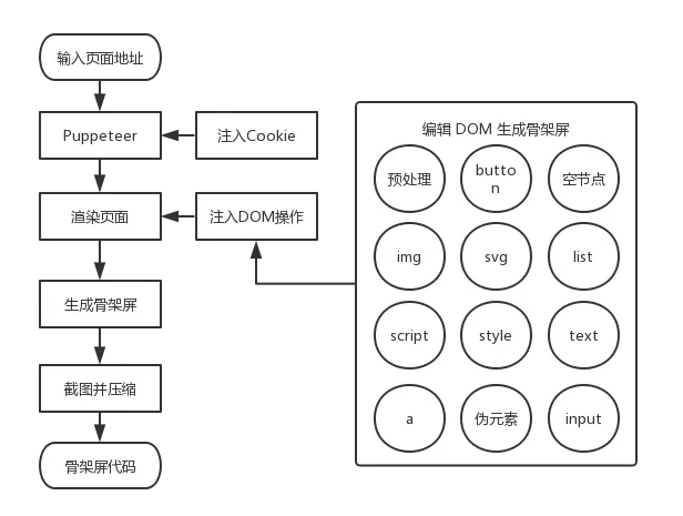 借助 Puppeteer,我们对自动生成骨架屏方案进行了如下设计: