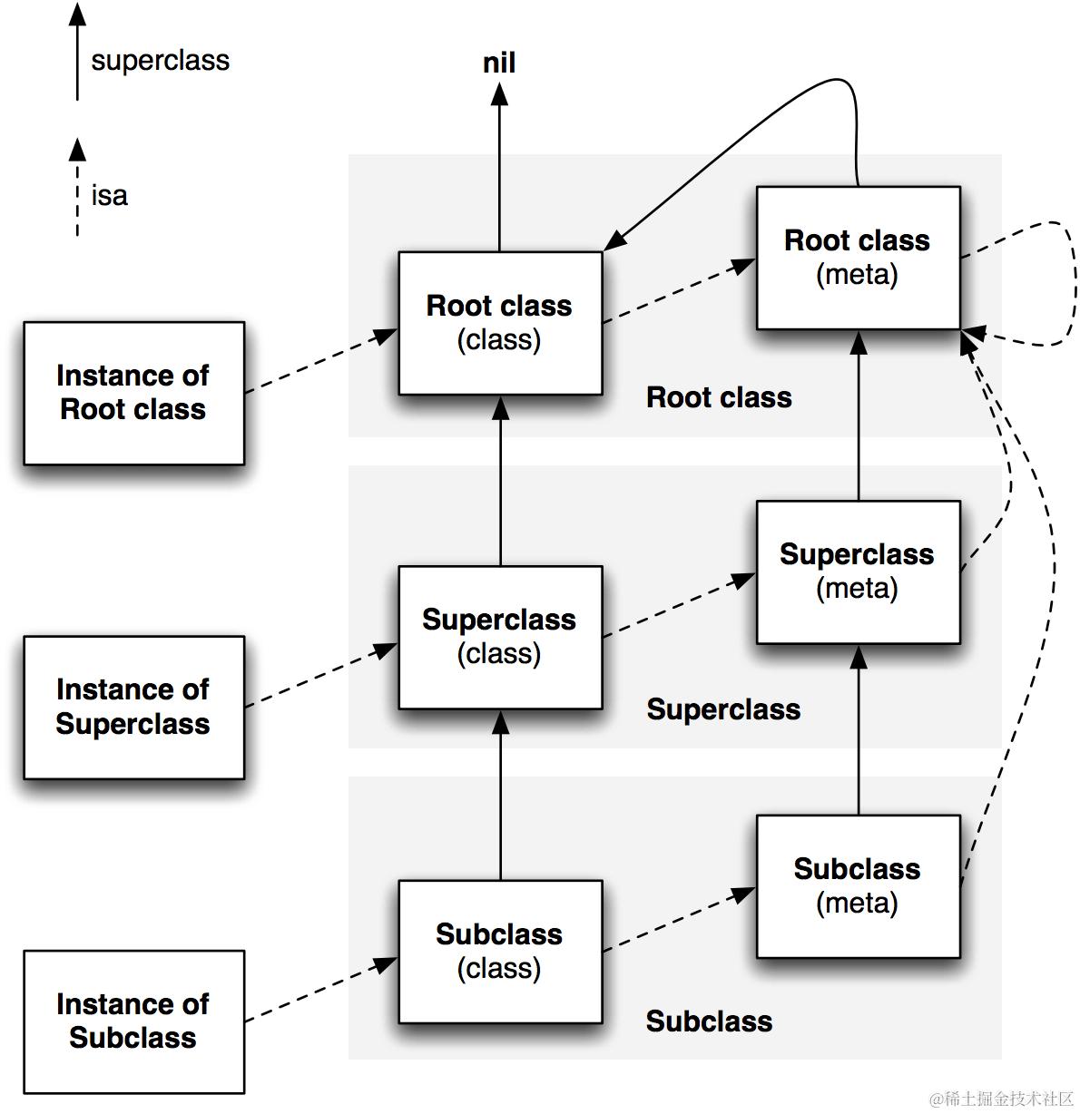 元类的类是根元类,根元类在继承体系中是根类的元类,根元类的类就是自己(即 isa 指针指向自己),根元类的superClass 指针指向 根类。