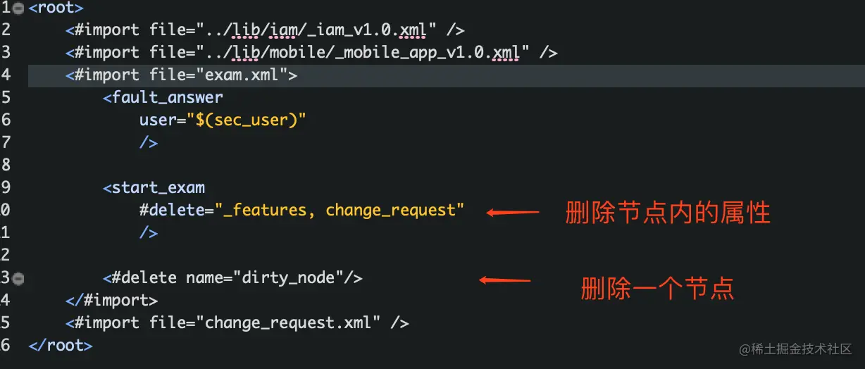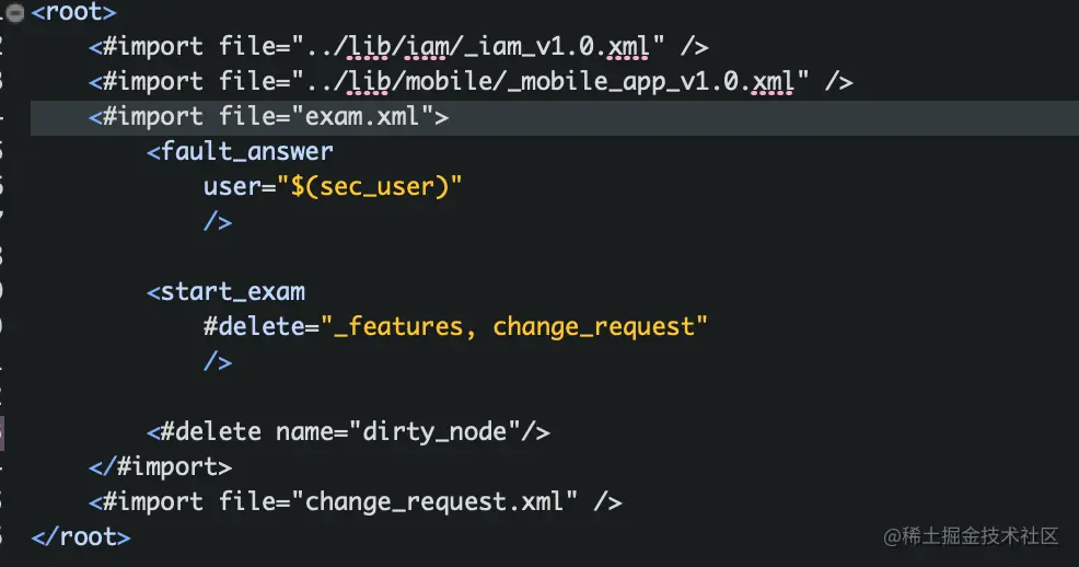 <root> <platform/> <#import file="../lib/iam/_iam_v1.0.xml" /> <#import file="../lib/mobile/_mobile_app_v1.0.xml" /> <#import file="exam.xml"> <fault_answer user="$(sec_user)" /> <start_exam #delete="_features, change_request" /> <#delete name="dirty_node"/> </#import> <#import file="change_request.xml" /> </root>