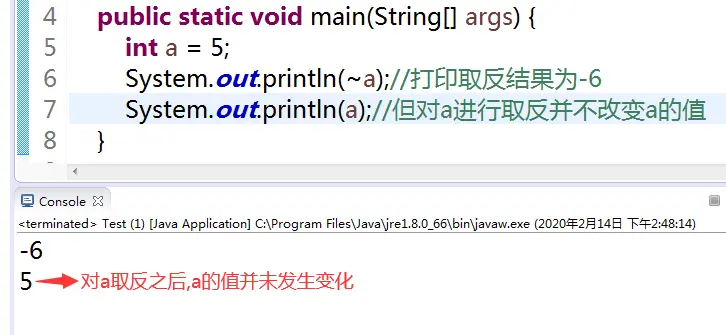 从程序运行的结果可以看出:输出a的值还是5,这说明变量a经过取反得到的那个-6并没有被赋值到变量a中,通过这个例子可以证明,取反运算并没有对变量重新赋值的功能,取反运算的结果只是临时保存在操作数栈中,变量本身的值不会因取反操作而发生改变。
