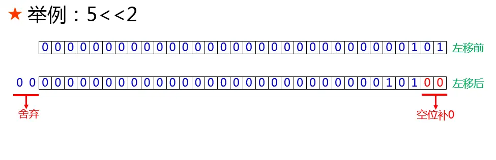 左移运算符的写法是”<<“,看上去向两个向左的箭头,表示要把二进制数据在内存空间中向左边移动。使用左移运算符时,把想进行位移操作的操作数放最左面,之后写上左移运算符,在左移运算符的右边写上移动的位数。例如:5<<2就表示对数字5进行左移2位的操作。下图展示了进行左移操作之后,二进制串在内存中是怎样变化的: