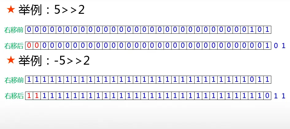 从图上可以清楚的看到带符号右移操作在二进制串移动之后左边空位是怎样被填充的。之前强调过,左移操作具有乘以2的N次方的效果,其实带符号右移也具有”类似”除以2的N次方的效果。请注意,这里说的是”类似”除以2的N次方的效果,为什么要加上”类似”两个字呢?就是因为对于正数而言,带符号右移之后产生的数字确实等于除以2的N次方,但是对于负数而言,带符号右移是在除以2的N次方的结果之上还要减去1。比如对于正5,带符号右移两位的结果是1,而对于-5,带符号右移两位的结果是-2,也就是-5被2的2次方整除再减去1的结果。