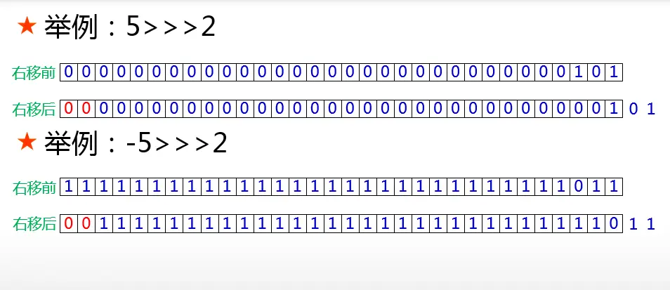 前文已说过:右移运算分为两种,分别是带符号右移和无符号右移。现在再来讲解无符号右移。无符号右移运算符的写法是”>>>”,比带符号右移多了一个”>”。带符号右移的运算规则与无符号右移的运算规则差别就在于:无符号右移在二进制串移动之后,空位由0来补充,与符号位是0还是1毫无关系,如下图: