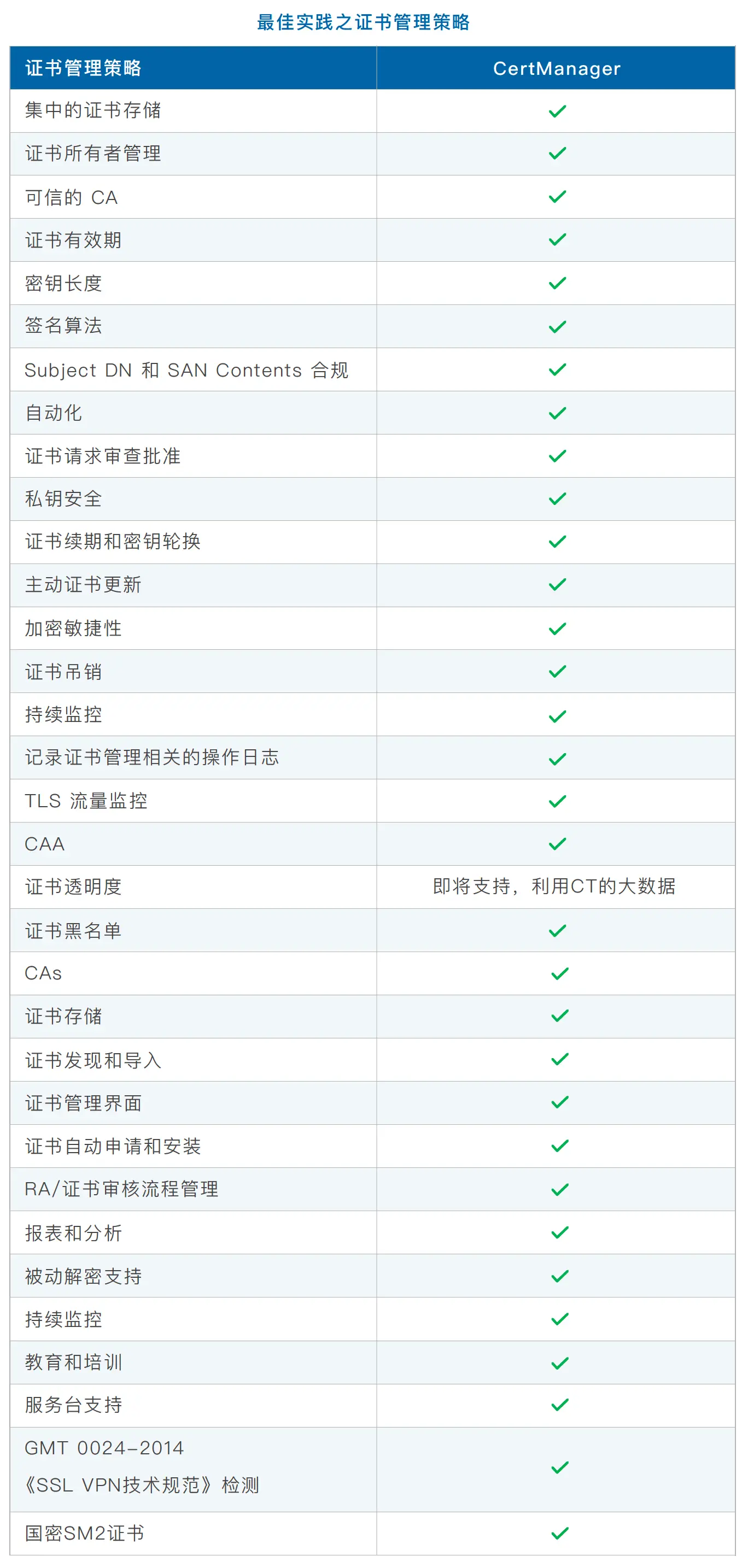 在NIST NCCoE制定的TLS服务器证书管理最佳实践的草案中,CertManager 证书管理解决方案符合所有的实践条款。(见下图)