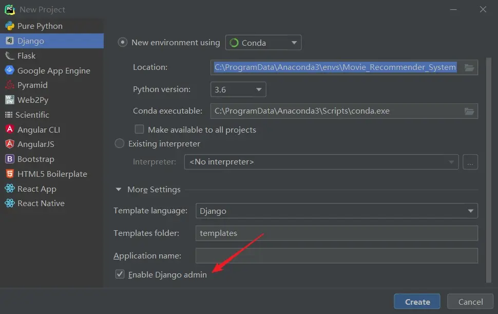 同时勾选上 Enable Django admin ,点击创建。