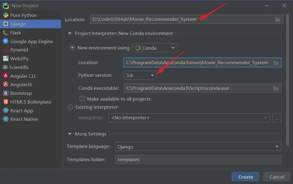 因为我需要用到 Django ,所以创建的是 Django 项目,指定项目路径,此时会自动生成和项目同名的新环境,勾选 Python 版本为 3.6。