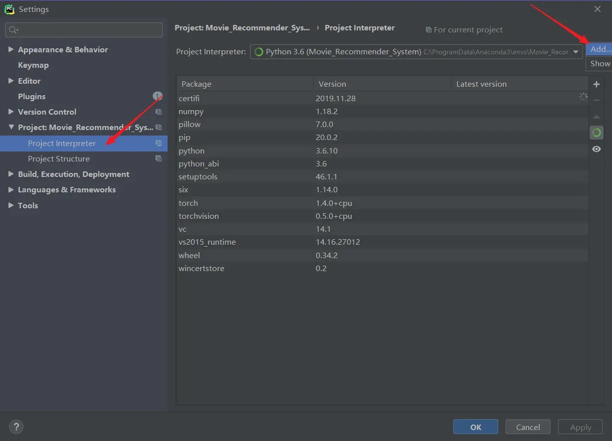 再到设置里,选择 Project Interpreter ,再勾选右边的 Add 。