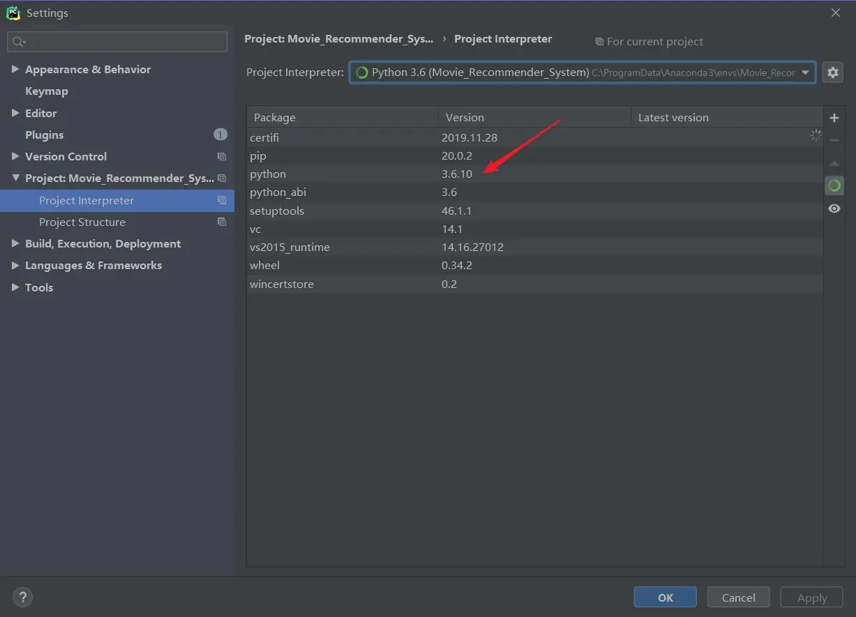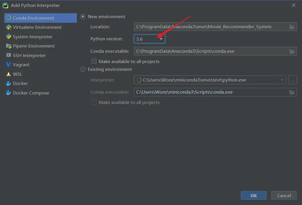 此时出现下面界面,发现 Python 版本并不是 3.6 ,再重新修改版本为 3.6 ,点击 OK 。