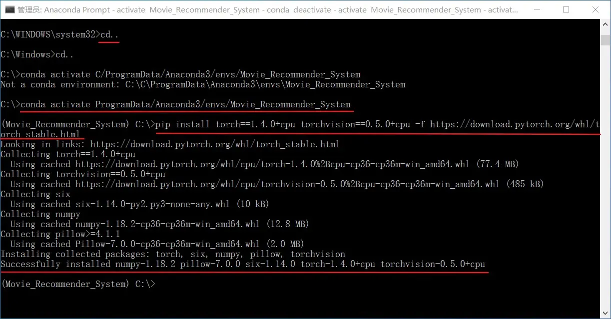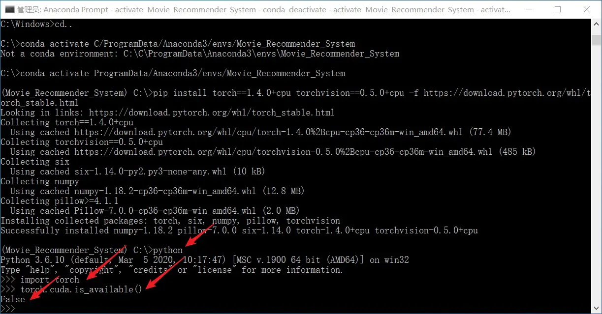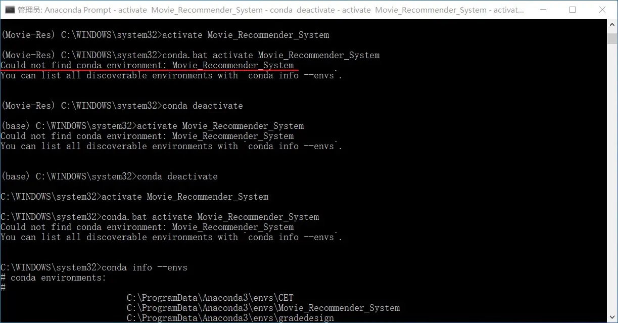第一次是安装之前的环境,第二次是安装之后的环境,可以看到已经有 Movie_Recommender_System 环境了。