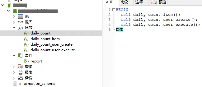 使用发现,事件定义中只能调用一个过程,如果需要执行多个任务,可以在事件中调用一个任务列表过程,如图,在事件列表中调用daily_count,再由daily_count过程依次调用其他多个过程