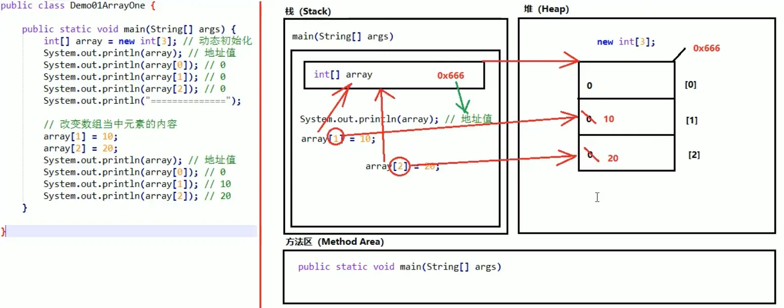 当我们只用array访问时,表示的是栈里保存的那个地址,映射的是堆中new出来的数组的地址。