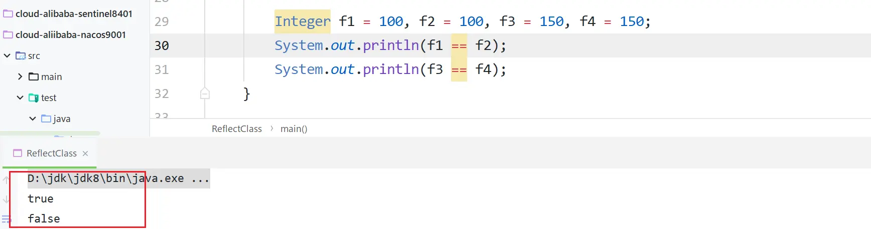 }f1, f2装箱,100位于 -128 ~ 127之间,直接指向常量池的cache[100 + (--128)],所以 == 比较为true,f3, f4不在,所以直接在堆内存中分配Integer对象,== 为false
