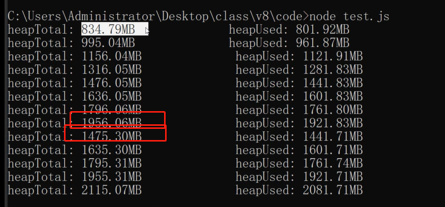 在红框标注的地方,就进行了内存回收,会感觉到一丝丝卡顿,因为v8回收内存的时候,会暂停执行,回收一次100MB,大概需要6ms
