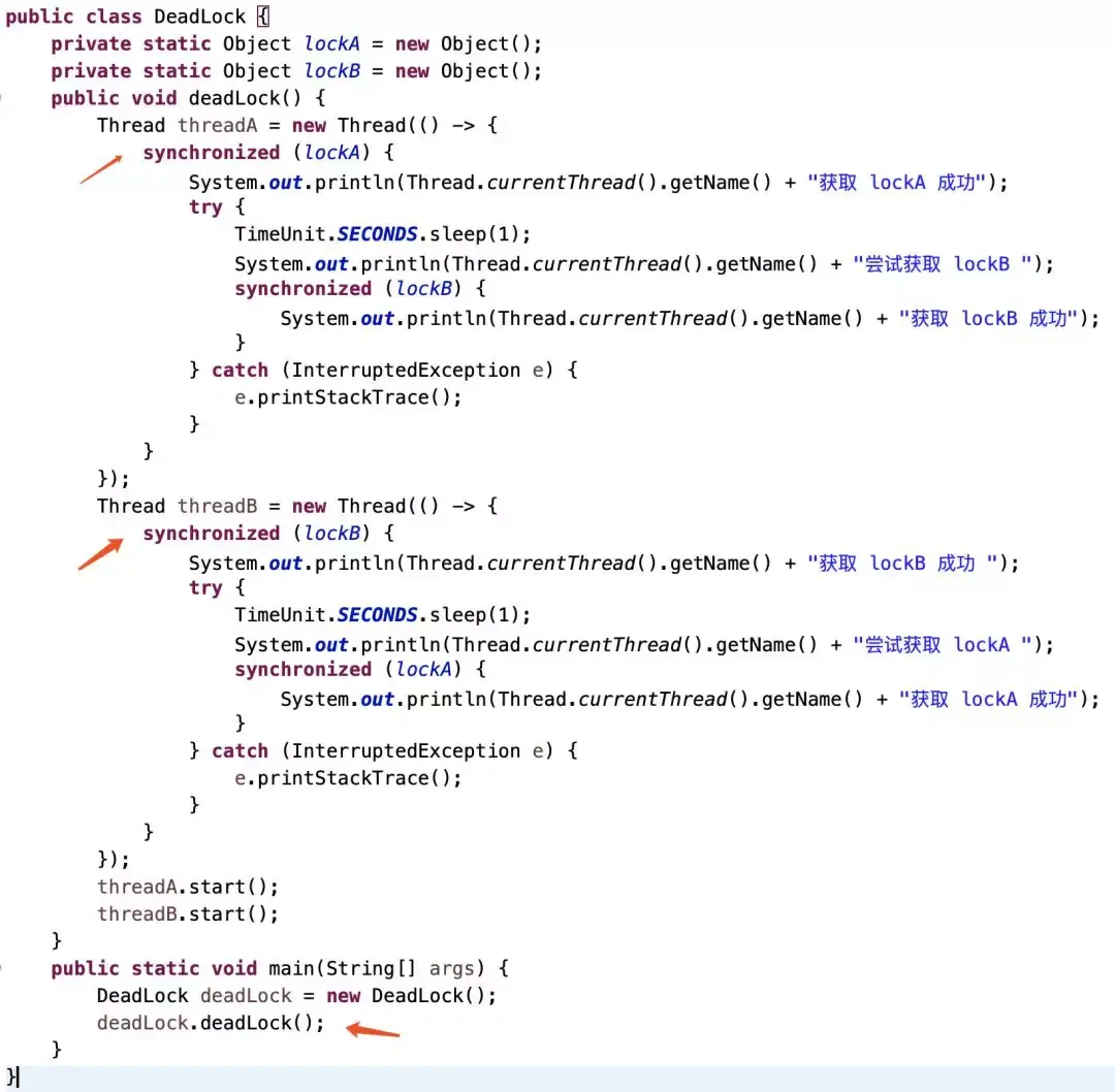 死锁的本质,举个例子如果此时有一个线程 A ,按照先获持有锁 a 再获取锁 b的顺序获得锁,同时另外一个线程 B,按照先获取锁 b 再获取锁 a 的顺序获取锁。如下图所示: