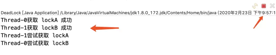当Thread1线程进入公共方法时,获取了A锁,另外Thread2又进来了,但是A锁已经被Thread1线程获取了,所以只能阻塞等待。Thread1接着又获取锁B,Thread2线程就不能再获取不到了锁A,更别说再去获取锁B了,这样就有一定的顺序了。只有当线程1释放了所有锁,线程B才能获取。