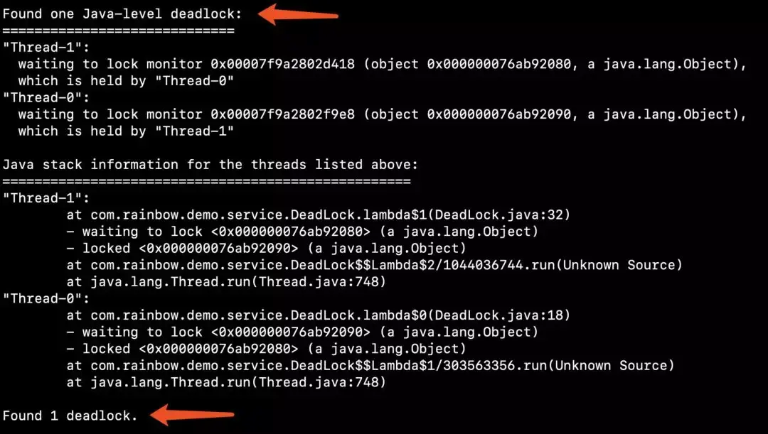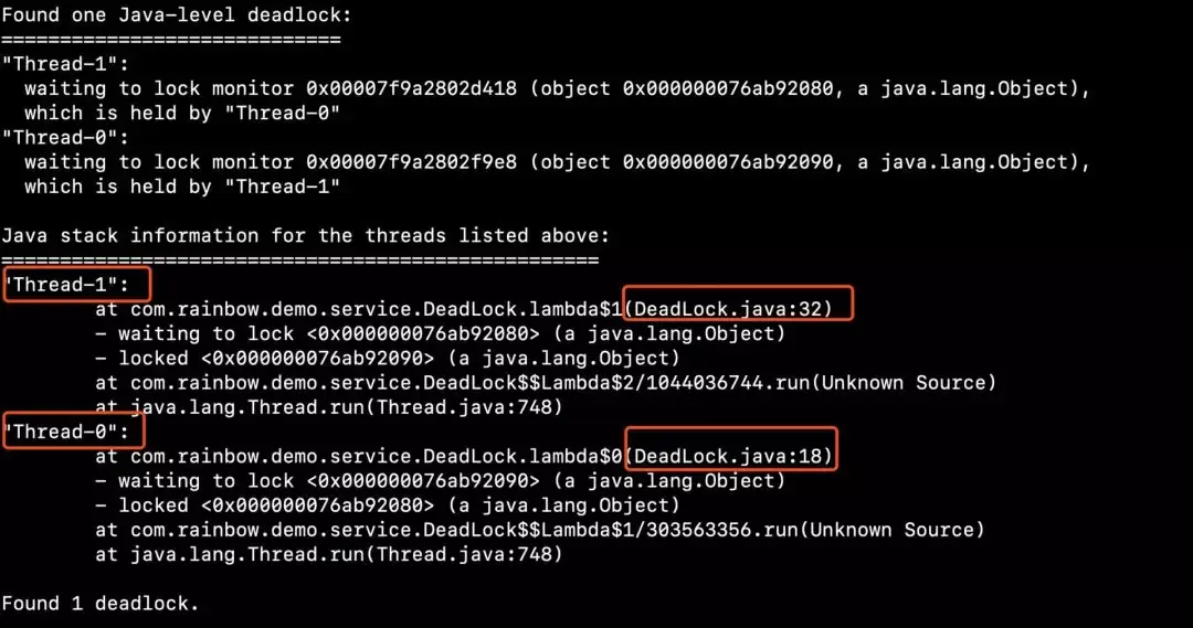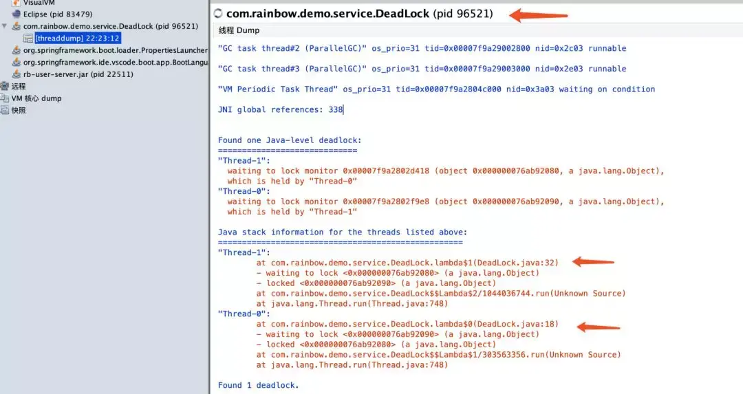 $ jstack 96521从上面的堆栈信息中我们可以发现这个内容:“Found one Java-level deadlock”,表示程序中发现了一个死锁,后面包含更多详细的信息,重点下面: