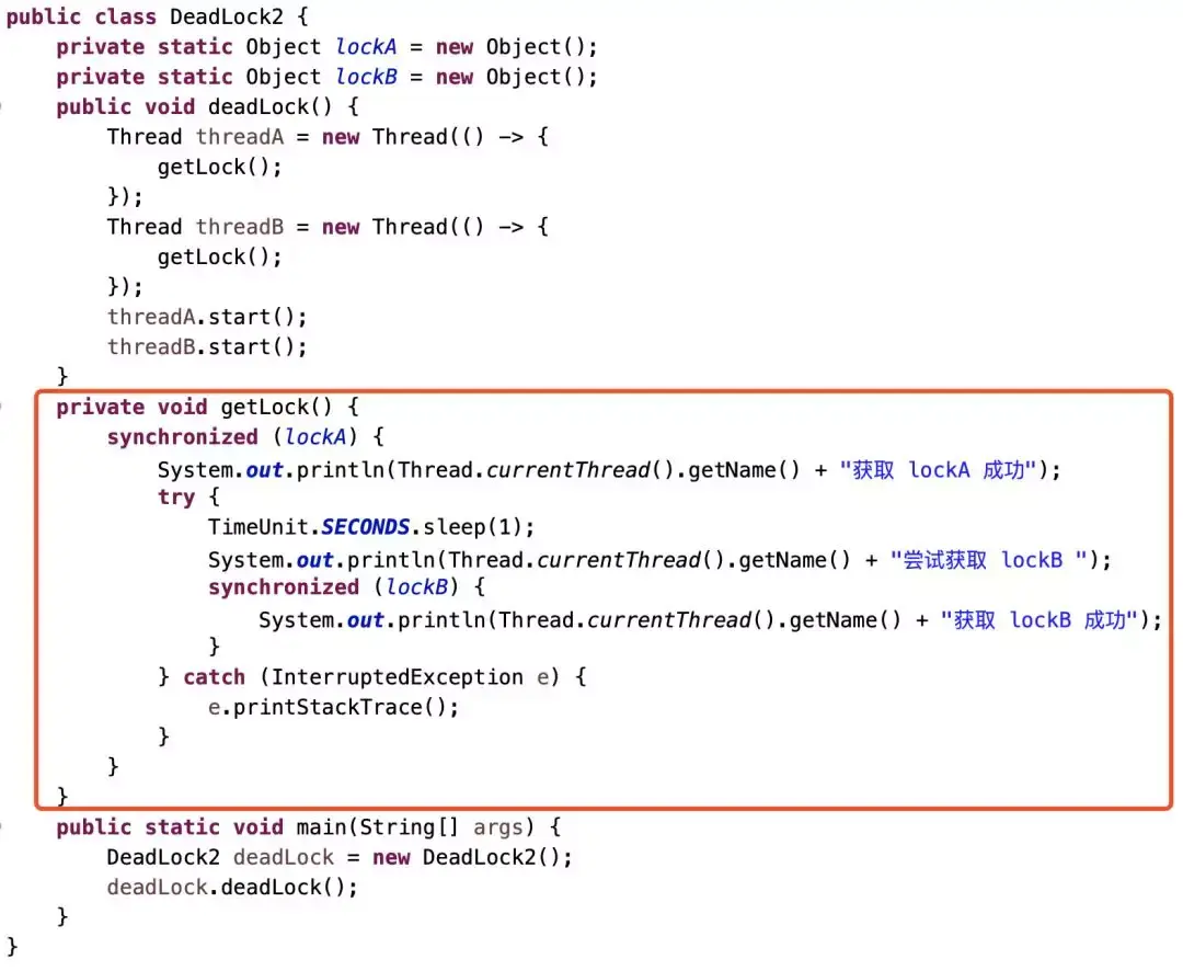 上面的例子出现死锁的根本原因就是获取所的顺序是乱序的,超乎我们控制的。上面例子最理想的情况就是把业务逻辑抽离出来,把获取锁的代码放在一个公共的方法里面,让这两个线程获取锁都是从我的公共的方法里面获取。