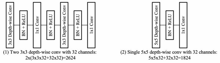 在 ShuffleNet 中,5x5 的 depth-wise 卷积获得两倍感受野,仅比 3x3 的 depth-wise 卷积增加极少的计算量(如图 3)。