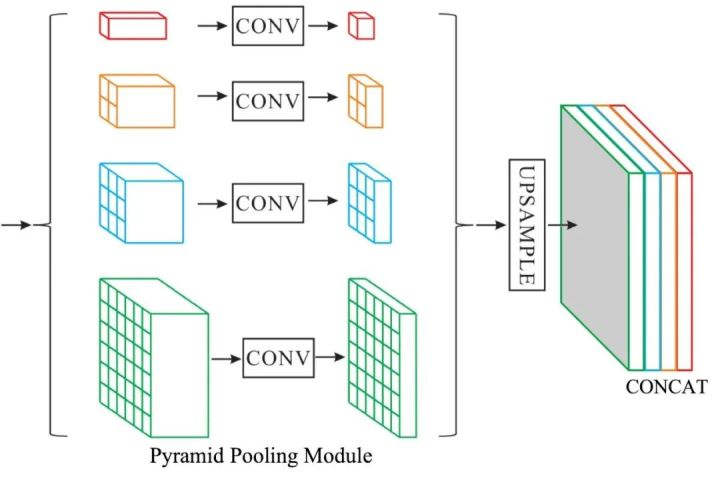 对此,我们借鉴图像分割方法 PSPNet[22](见图 5)的金字塔池化(Pyramid PoolingModule,PPM),提出了金字塔插值(Pyramid Interpolation Module,PIM)同时实现多尺度特征的融合和特征图的插值(见图 4 蓝框)。