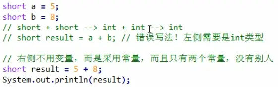 byte、short、char三种类型,如果右侧赋值的数值没有超过左侧的范围,编译器会自动隐含地帮我们自动补上;如果超过了左侧的范围,直接报错 - 在给变量进行赋值的时候,如果右侧的表达式中全都是常量,没有任何变量,那么编译器javac会直接将若干个常量表达式计算得到结果。编译时赋值,不用等到运行时再去耗费cpu计算,这称为编译器的常量优化,但是一旦表达式中有其他变量参与(有符号引用),那么就不能进行这种优化了