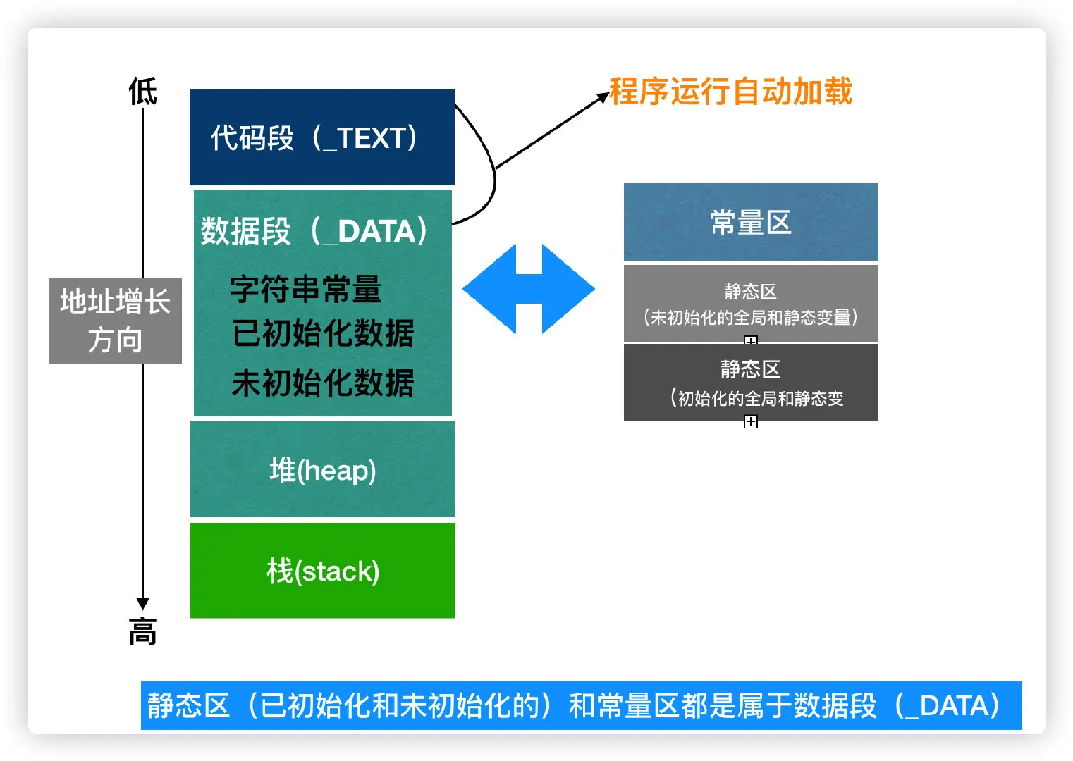 - 接着系统会先加载二进制代码到内存中,然后加载常量区中的常量,接着加载全局区和静态区(初始化过的静态区和没有初始化过的静态区是分开的)