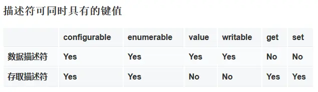 数据描述符和存取描述符具有以下可选键值: - configurable:该属性描述符能否被改变,默认false