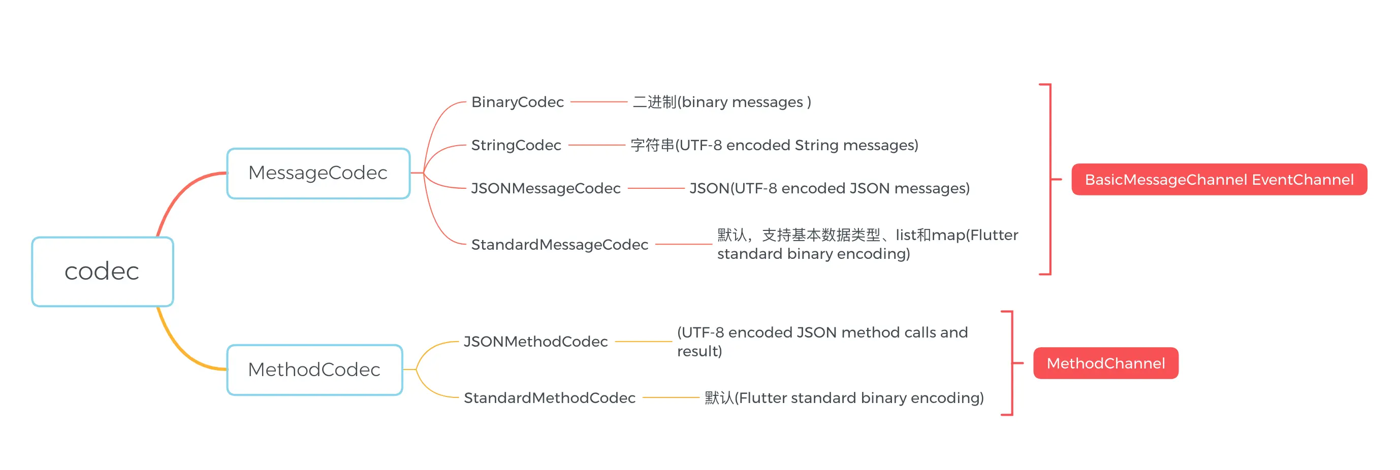 name:String 类型,表示 channel 的名字,全局唯一(The logical channel on which communication happens)codec:MessageCodec 类型,消息的编码解码器(The message codec used by this channel)binaryMessenger:BinaryMessenger类型,用于发送数据(The messenger used by this channel to send platform messages)