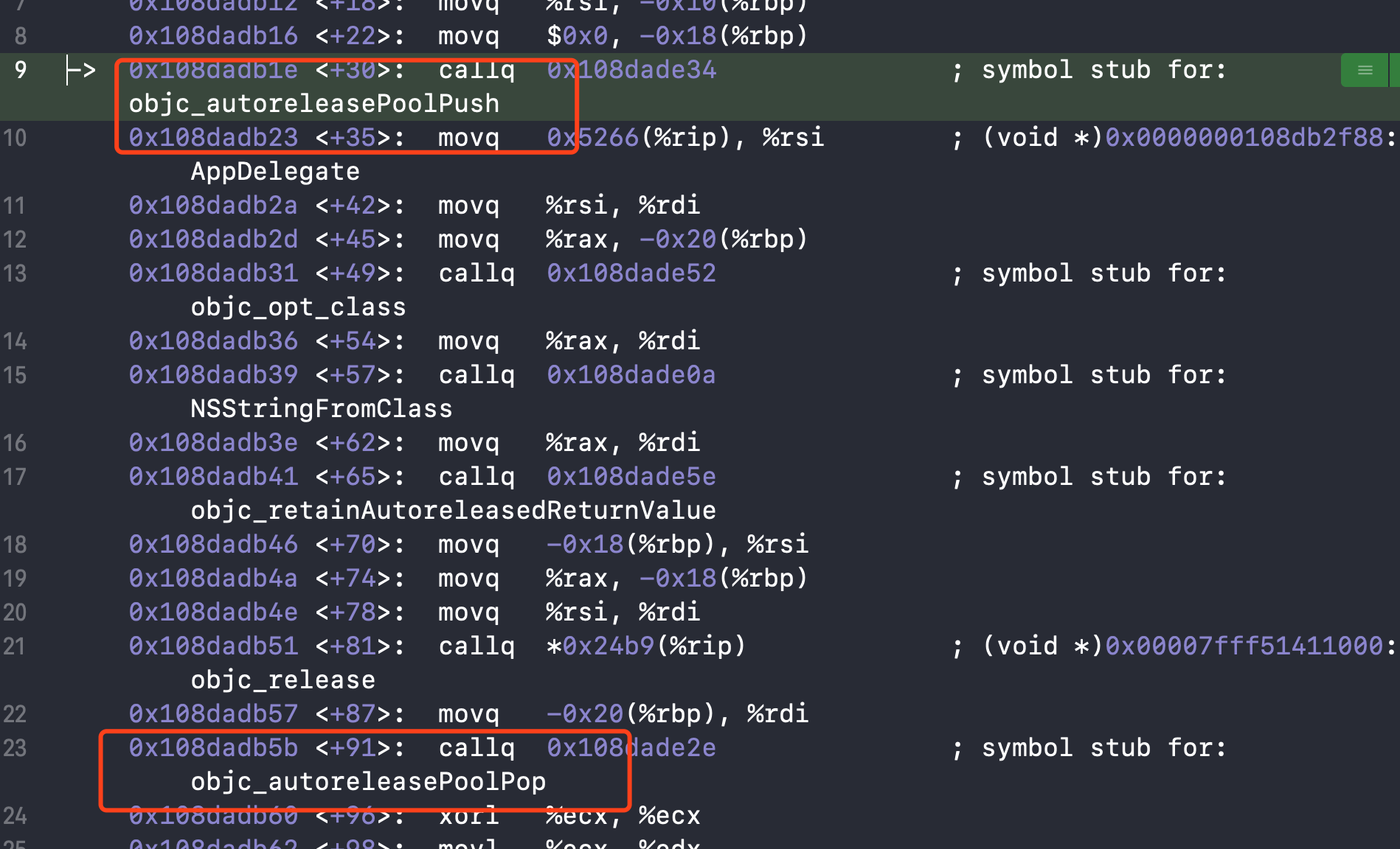 在@autoreleasepool出设置一个断点运行程序,进入汇编也可以看到,程序的入口处是objc_autoreleasePoolPush,出口处是objc_autoreleasePoolPop: