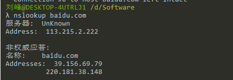 举个例子,比如你想查询百度的IP地址,你就可以输入nslookup baidu.com查询就可以看到系想要的IP地址,如图: