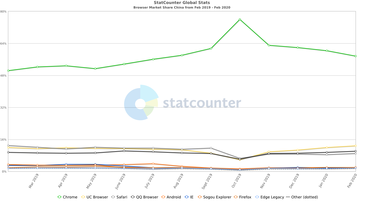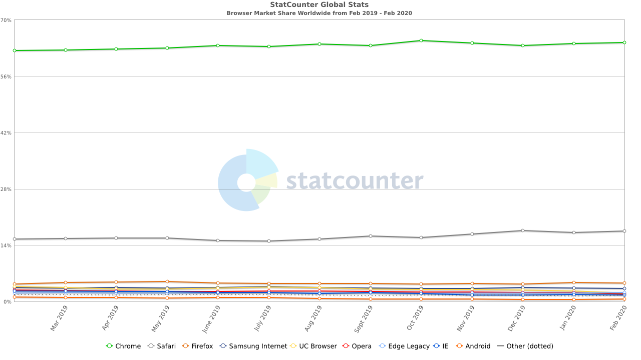 2019年2月-2020年2月全球范围内chrome达到了恐怖的64.45%: