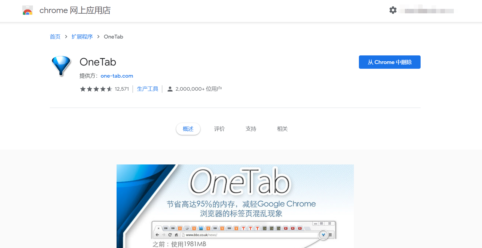 Chrome每个标签都是一个独立进程,耗费大量内存,让你的电脑不断变慢,而安装OneTab能为您节省高达95%的内存,并减轻标签页混乱现象。 安装OneTab后,只需点击一下扩展图标,OneTab就会将你打开的标签聚合在一起,成为一个列表,相当于只打开一个标签,要是想找回可以直接去列表中单独恢复或全部恢复,除此之后,还支持分类归档,自定义组名,有效提高使用效率。