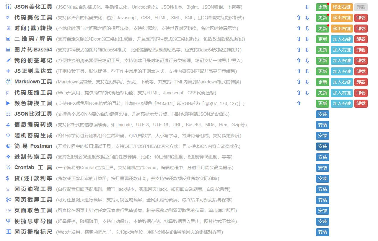 强烈推荐,功能太多了,前端开发的工具集,包含了JSON自动格式化、手动格式化,支持排序、解码、下载等功能,可以在配置页选择性安装需要的功能,全部功能见下图: