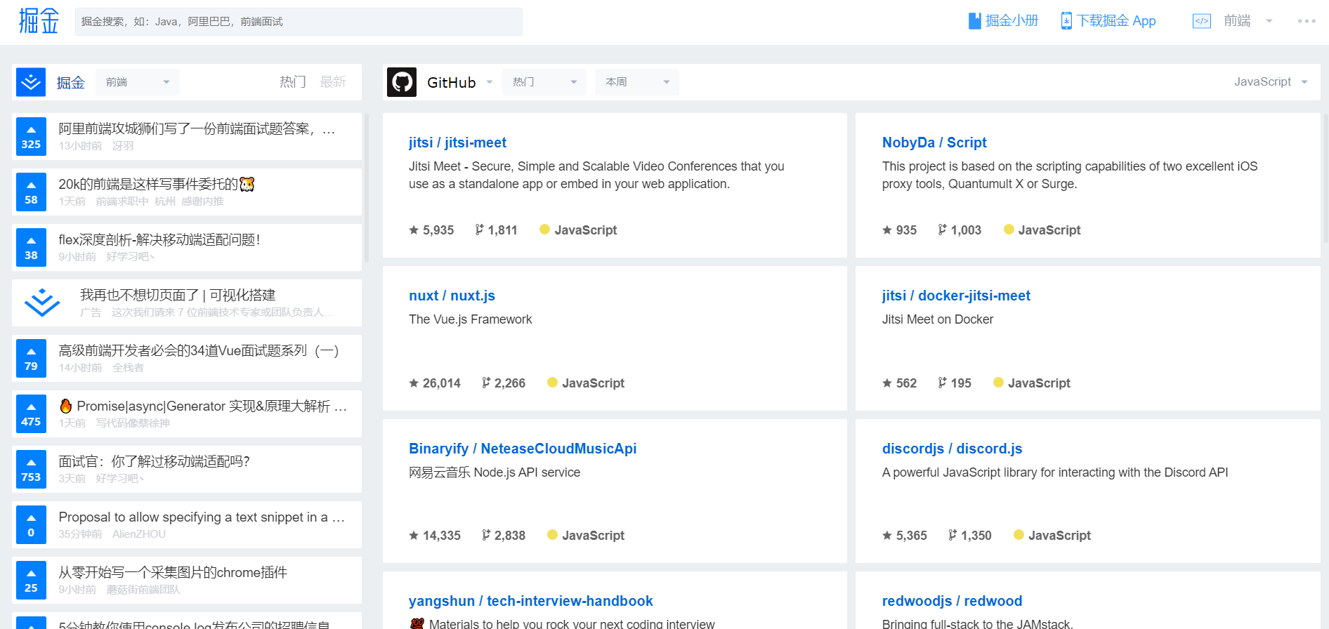 安装后,打开新标签页就是插件显示的内容聚合页,包括掘金热门文章和github热门项目等,可切换语言、领域查看。