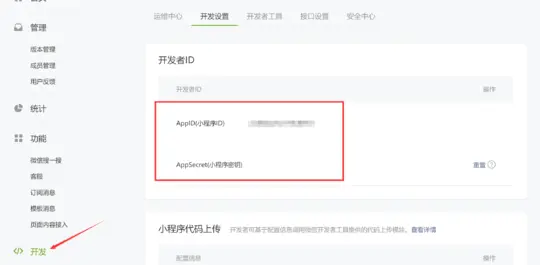 js_code 就是我们通过 wx.login 得到的 code,grant_type 为 authorization_code,只剩下 appid 和 secret 需要我们登录微信公总平台里面找
