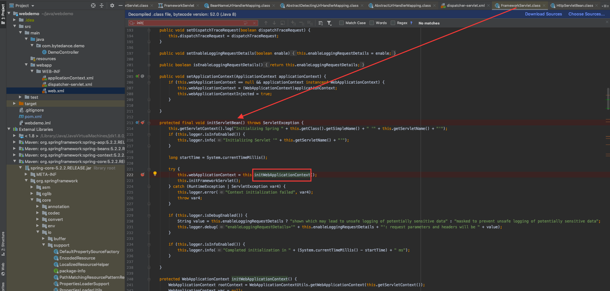 initServletBean执行的是Dispatcher 另外一个父类FrameworkServlet的initServletBean方法,Dispatcher也会调用initWebApplicationContext方法创建自己的applicationContext,并把contextLoader创建的xmlWebApplicationContext设置为根context,这样设置的好处是dispatcher可以访问xmlWebApplicationContext共享的bean,本示例没有涉及到