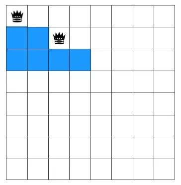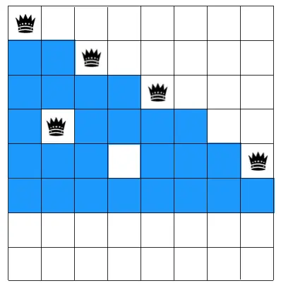 在第一行从左到右先选择一个位置放置皇后,由于第一行放了皇后,第二行可放皇后的位置受到了限制(下图蓝色区块表示对应行的格子不能放皇后)