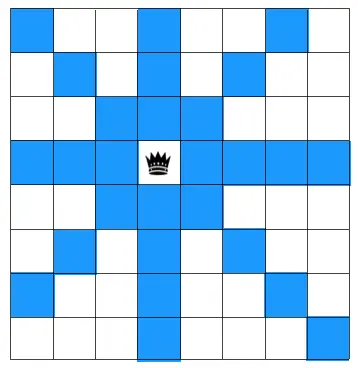 举个简单的下图所示的例子,如果在棋盘上放置一个皇后,则与这个皇后同一行,同一列,且皇后所在斜线经过的格子不能再放其他皇后。