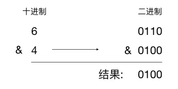 举个简单的例子, 当我们要计算 6 & 4 的结果,在做位运算的时候首先要把 6,4 转成二进制,然后再做相应的位操作(与)。
