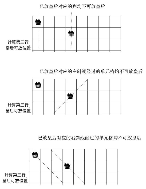 第二行我们选第三个格子放皇后,选完开始在第三行选,第三方可选的位置也受到了第一,二行皇后所放位置的影响