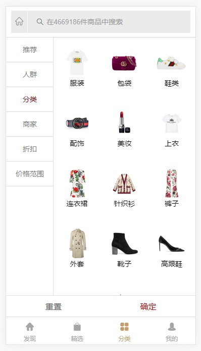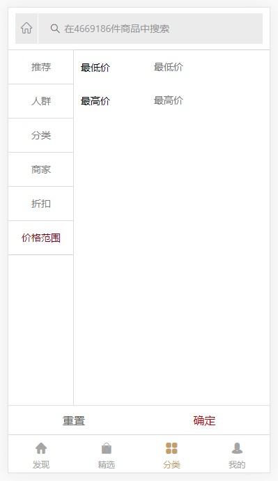 在选择了任意分类项后点击 重置 可以把所有选中的项或输入的值恢复到未设置状态。