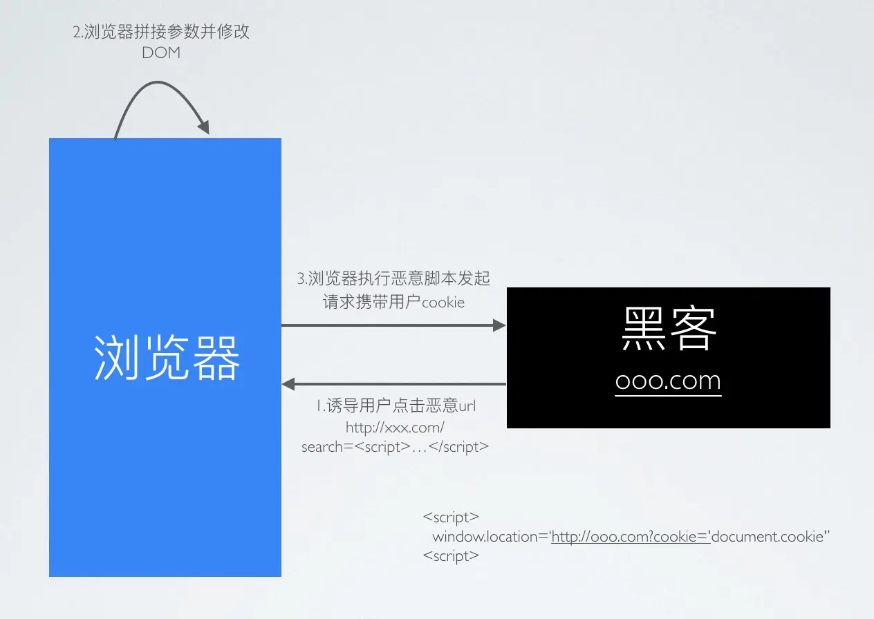 而基于DOM型的XSS 攻击中,取出和执行恶意代码由浏览器端完成,属于前端 JavaScript 自身的安全漏洞,其他两种 XSS 都属于服务端的安全漏洞。