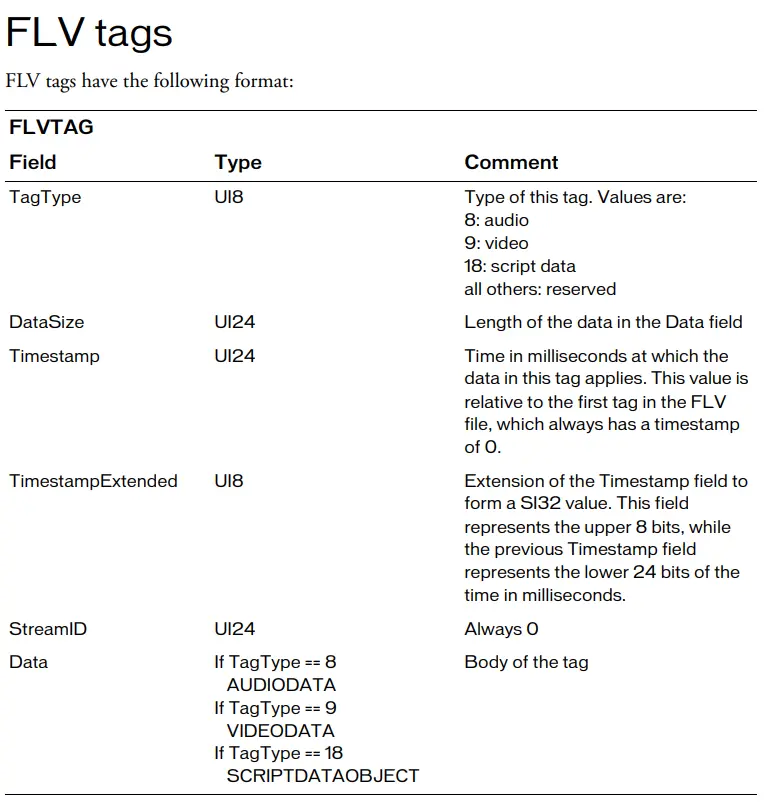 - TagType:Tag类型,8为音频Tag,9为视频Tag,18为脚本Tag