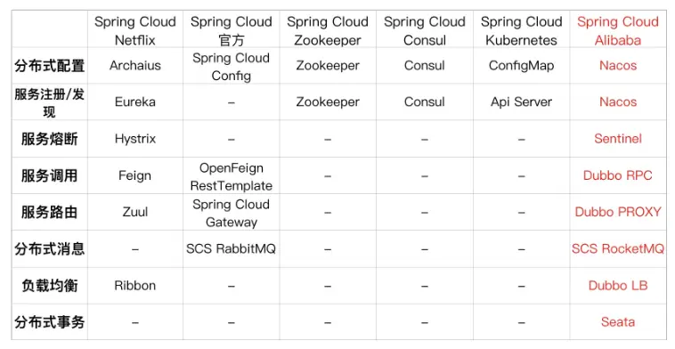 作为 Spring Cloud 体系下的新实现,Spring Cloud Alibaba 跟官方的组件或其它的第三方实现如 Netflix,Consul,Zookeeper 等对比,具备了更多的功能: